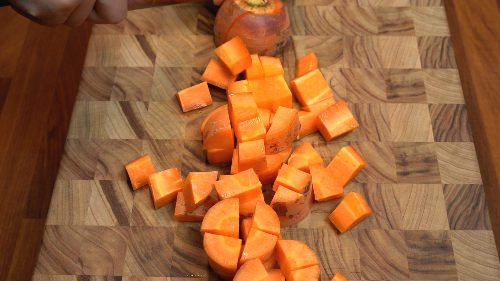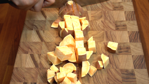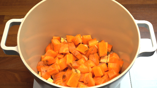 2. 고구마와 당근은 깍둑 썰어 냄비에 넣는다.