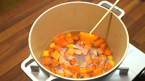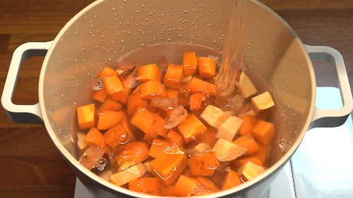 3. 고구마와 당근이 잠길 정도로 물을 붓고 뚜껑 덮어 강불로 끓인다.