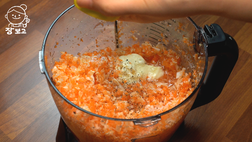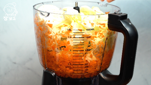 1. 다지기에 당근 1개 먼저 넣고, 세척한 양배추 1/5개, 양파 1/2개 넣고 원하는 크기로 다진다.