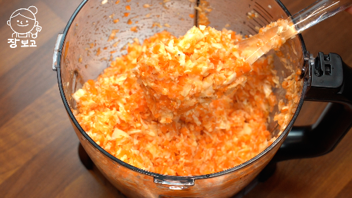 1. 다지기에 당근 1개 먼저 넣고, 세척한 양배추 1/5개, 양파 1/2개 넣고 원하는 크기로 다진다.