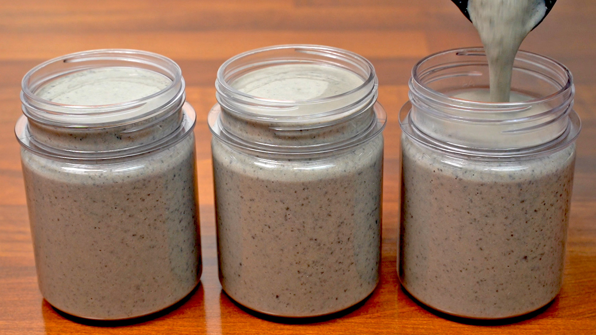 1. 삶은 콩, 콩 삶은 물, 캐슈너트, 소금 약간 넣고 물을 갈릴정도로만 넣고 되직하게 간다. 물 양만 다르다.