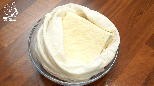 3. 면포에 부침두부 넣고 물기를 꼭 짠다.