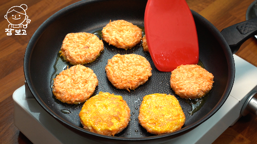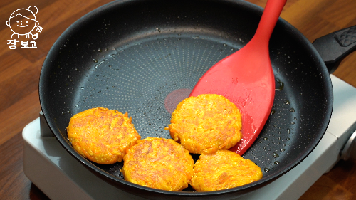 6. 팬에 기름 둘러 중불로 예열하고 당근 반죽 올려 앞뒤로 노릇하게 부친다.