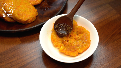 완성된 당근 두부 전과 들깨 간장 소스