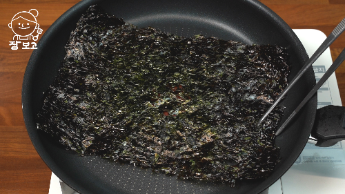 1. 묵은 김은 마른 팬에 앞뒤로 구워 김 비린내를 날린다. 색이 살짝 밝아질 때까지 구워주면 바삭해진다. 김을 한 번 구우면 김의 식감이 덜 질기다.