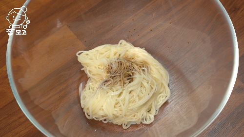 소면 삶아서 간장 1큰술 넣고 조물조물 무쳐 양념해주고