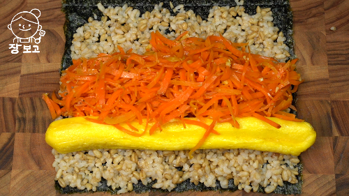 8. 김밥 김 거친 면 위에 밥 한 덩이 얇게 편다. 계란말이와 볶은 당근 수북이 올려 말아준다
