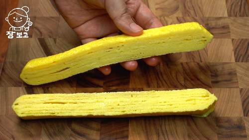6. 만든 계란말이는 길게 2등분 한다. 계란말이 윗부분이 익었을 때까지 기다렸다가 재빨리 말면 겹겹이 식감이 좋다.