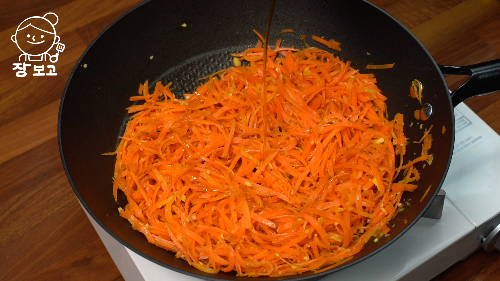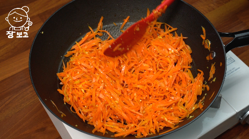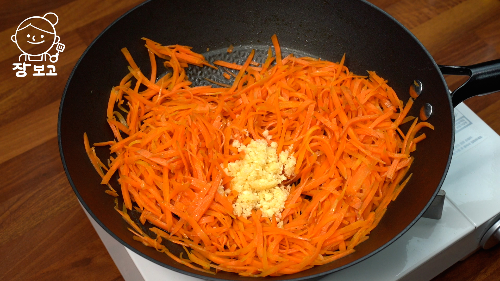 3. 당근이 부드러워지면 다진 마늘 1큰술 넣고 볶다가 불을 끄고 참기름 약간 둘러 섞는다