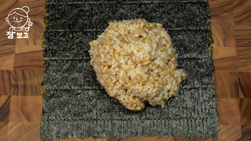 8. 김밥 김 거친 면 위에 밥 한 덩이 얇게 편다. 계란말이와 볶은 당근 수북이 올려 말아준다