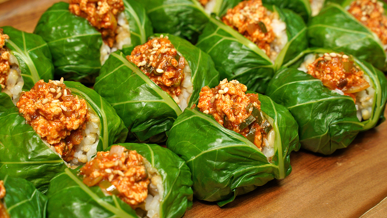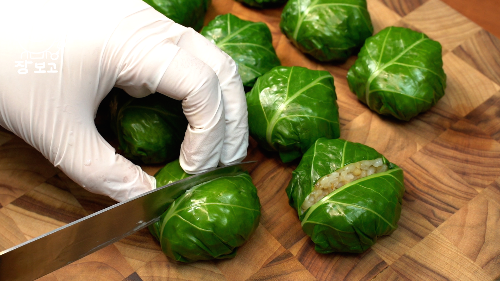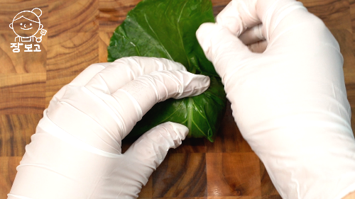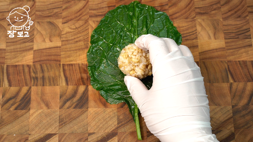 5. 케일 잎 줄기가 튀어나온 뒷 면 위에 밥을 올리고 케일 잎을 감싼다