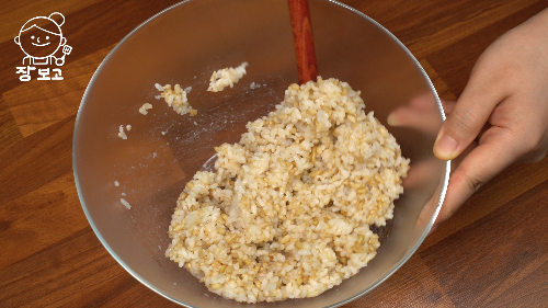 3. 현미밥 두 공기에 참기름 1큰술, 소금 1작은술, 통깨 1큰술 넣고 잘 섞는다