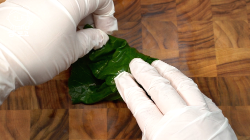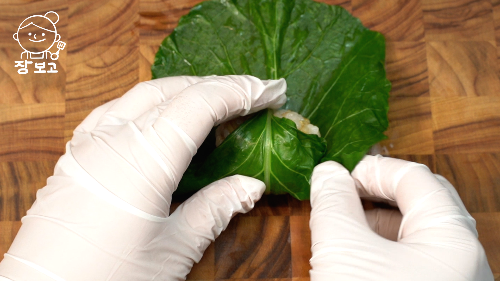 5. 케일 잎 줄기가 튀어나온 뒷 면 위에 밥을 올리고 케일 잎을 감싼다