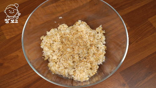 3. 현미밥 두 공기에 참기름 1큰술, 소금 1작은술, 통깨 1큰술 넣고 잘 섞는다