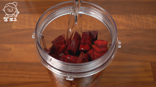 3. 한김 식힌 당근과 비트를 넣고, 코코넛 워터 330ml를 붓는다. 코코넛 워터가 없다면 330ml의 물을 부어도 된다