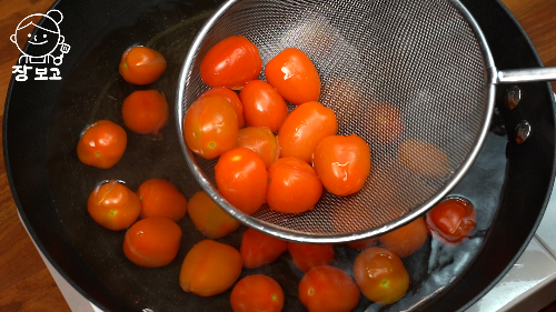 3. 토마토의 껍질이 일어나면 채로 건져 찬물에 담가 껍질을 벗긴다