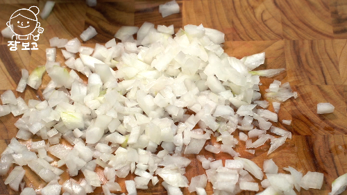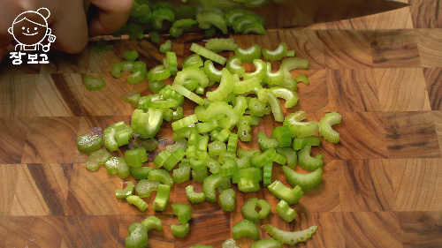 2. 양파 1/2개 다지고 셀러리 1대로 쫑쫑 썰어 넣는다. 셀러리를 넣으면 향이 매우 좋고 아삭한 식감이 잘 어울린다