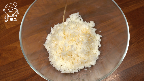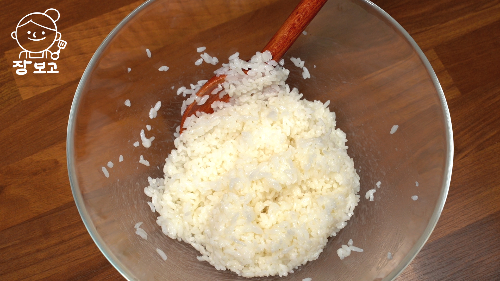 3. 밥 300g에 단촛물을 모두 넣고 주걱으로 잘 섞는다. 처음에는 알알이 흩어지다가 계속 섞으면 한 덩이가 된다