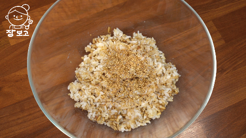 4. 현미귀리밥 300g에 소금 약간, 참기름 약간, 통깨 약간 넣고 잘 섞는다