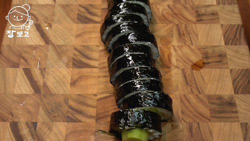 6. 참기름 살짝 발라주고 먹기 좋게 썰어주면 오이채 김밥 완성!