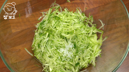 2. 오이 채에 소금 1작은술, 식초 2큰술, 매실청 1큰술 넣고 잘 섞어서 10분간 절인다