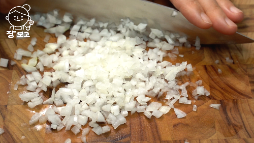 1. 청양고추 7개, 양파 1/2개 곱게 다져 팬에 넣는다