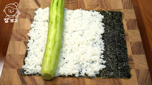 4. 김 거친 면 위에 초밥 깔아주고 통 오이 올린 뒤 잘 만다. 김 끝에 물을 바르면 풀리지 않고 잘 붙는다