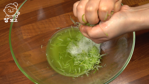 2. 오이 채에 소금 1작은술, 식초 2큰술, 매실청 1큰술 넣고 잘 섞어서 10분간 절인다