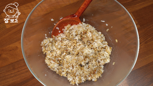 4. 현미귀리밥 300g에 소금 약간, 참기름 약간, 통깨 약간 넣고 잘 섞는다