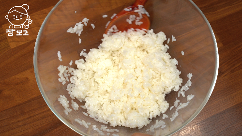 3. 밥 300g에 단촛물을 모두 넣고 주걱으로 잘 섞는다. 처음에는 알알이 흩어지다가 계속 섞으면 한 덩이가 된다