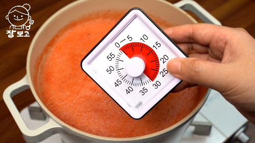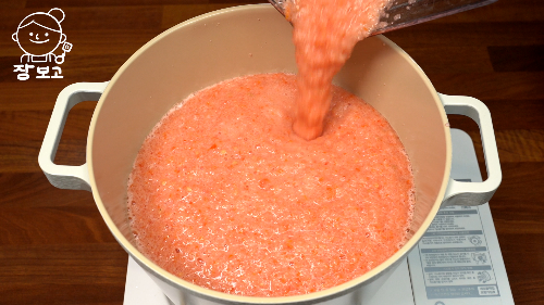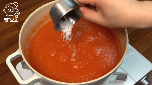 3. 냄비에 부어 강불로 끓인다. 토마토가 끓기 시작하면 중 약불로 낮춰서 뭉근하게 30분간 끓인다. 눋지 않게 잘 저어주기!