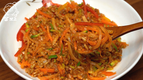 알록달록 다양한 채소에 기름기 적은 고기와 고추장 소스를 듬뿍 넣는다. 전혀 짜지 않다. 참기름과 통깨 약간 넣는다.