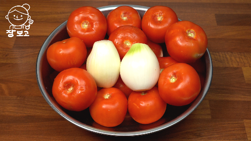 1. 깨끗이 세척 후 꼭지 제거한 토마토, 껍질 벗긴 양파 준비한다.