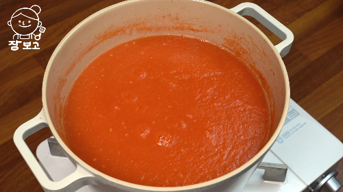 3. 냄비에 부어 강불로 끓인다. 토마토가 끓기 시작하면 중 약불로 낮춰서 뭉근하게 30분간 끓인다. 눋지 않게 잘 저어주기!