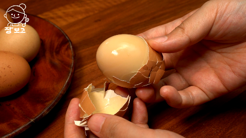 껍질 벗겨보니 엉겨 붙은 흰자 없이 깨끗하게 술술 잘 벗겨진다. 만약 껍질을 더 잘 벗기고 싶다면 뜨거울 때 찬물에 넣어 식히면 더 잘 벗겨진다.