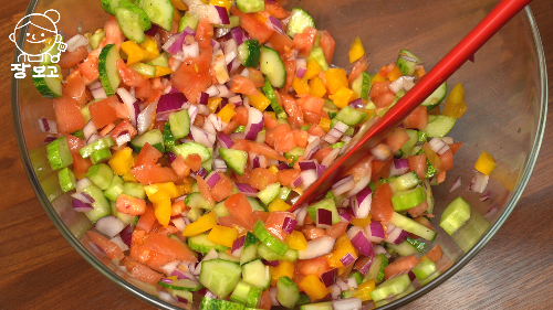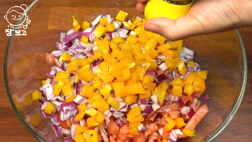오이, 완숙토마토, 적 양파, 파프리카, 레몬즙, 소금, 후추, 유리볼