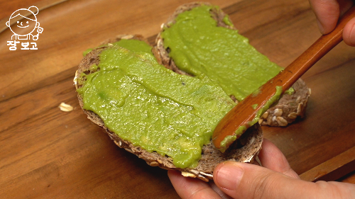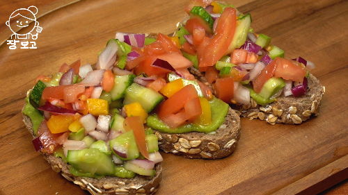 바삭하게 구운 잡곡빵에 으깬 아보카도 바르고 쉬라즈 샐러드 듬뿍 올린다.