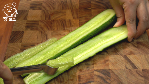 2. 만약 두고두고 먹으려면 길게 2등분한 뒤 집게 뒷면을 이용해 씨를 파낸 후 썰면 물이 덜 생긴다.