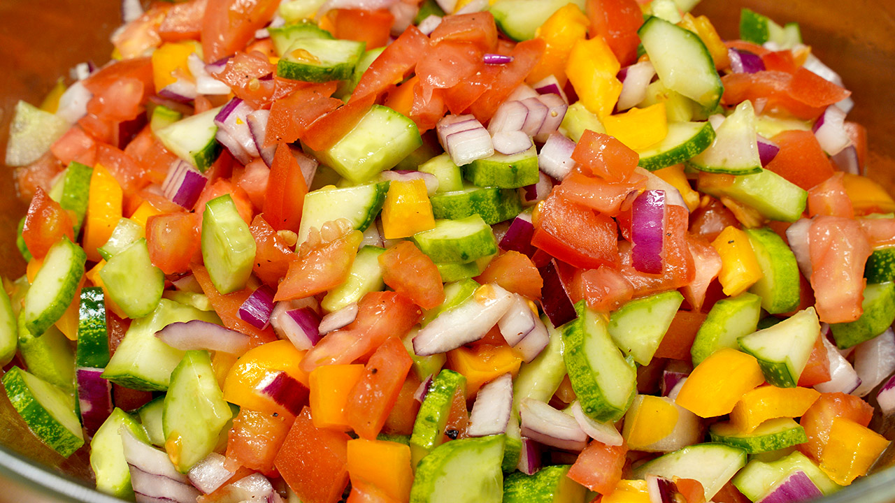 그럴 때는 오이와 토마토를 이용해서 이렇게 만들어 보세요! 바로 지중해식 샐러드인 쉬라즈 샐러드입니다. 만드는 방법은 매우 간단해요. 모든 재료를 깍둑 썰어서 버무리기만 하면 일주일 내내 냉장고에 두고두고 먹을 수 있거든요