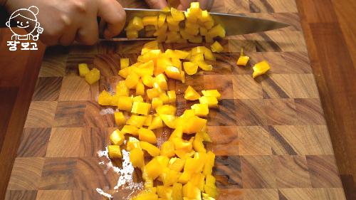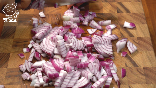 4. 적 양파로 작은 큐브 모양으로 썬다. 적 양파는 흰 양파보다 생으로 먹었을 때 매운맛이 덜하다.