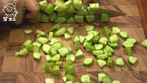 1. 오이는 쓴맛나는 끝부분을 제거하고 길게 4등분 한 다음 수저로 떠먹기 좋게 잘게 썬다.