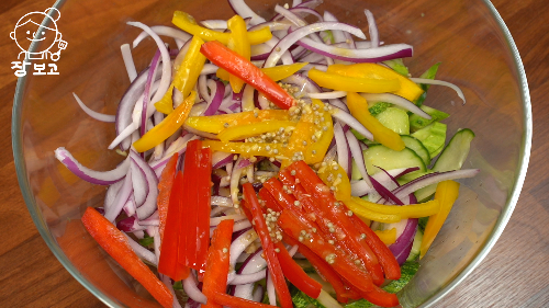3. 냉채에 파프리카를 넣으면 자연스러운 단맛이 나서 소스에 당류를 줄일 수 있어 좋다