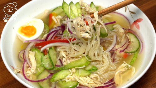 두유면에 닭가슴살 오이냉채 푸짐하게 얹어서 동치미 국물 부어주면, 더운 여름에 먹기 좋은 한 그릇 음식!