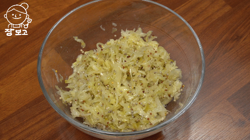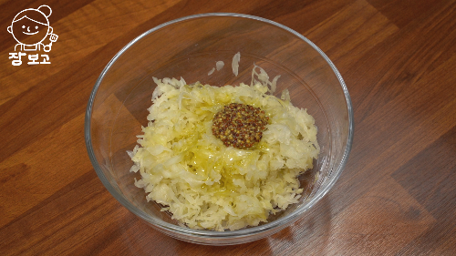 사워크라우트에 엑스트라 버진 올리브오일 약간, 홀그레인 머스터드 약간, 통 들깨 넣어서 잘 섞어준다.