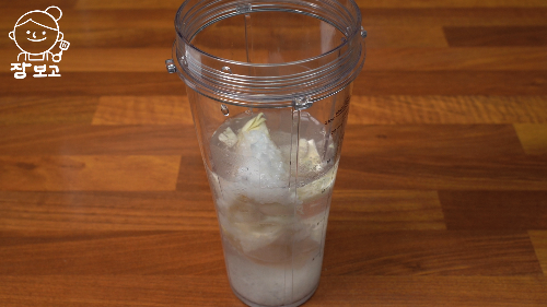 4. 양배추 심지와 물 300ml 믹서에 붓고, 소금을 넣는다. 이때 소금의 양은 (양배추무게 + 물 무게 x 0.02 = )