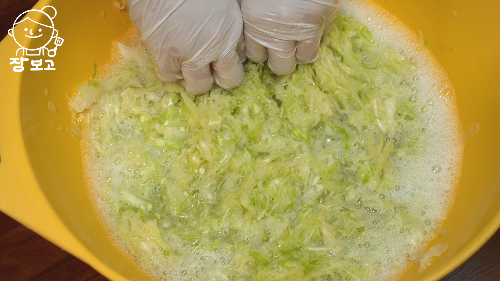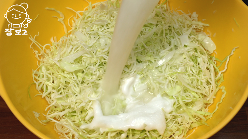5. 양배추 심지 소금물을 곱게 갈아 채친 양배추에 붓고 바락바락 5분 이상 주물러준다