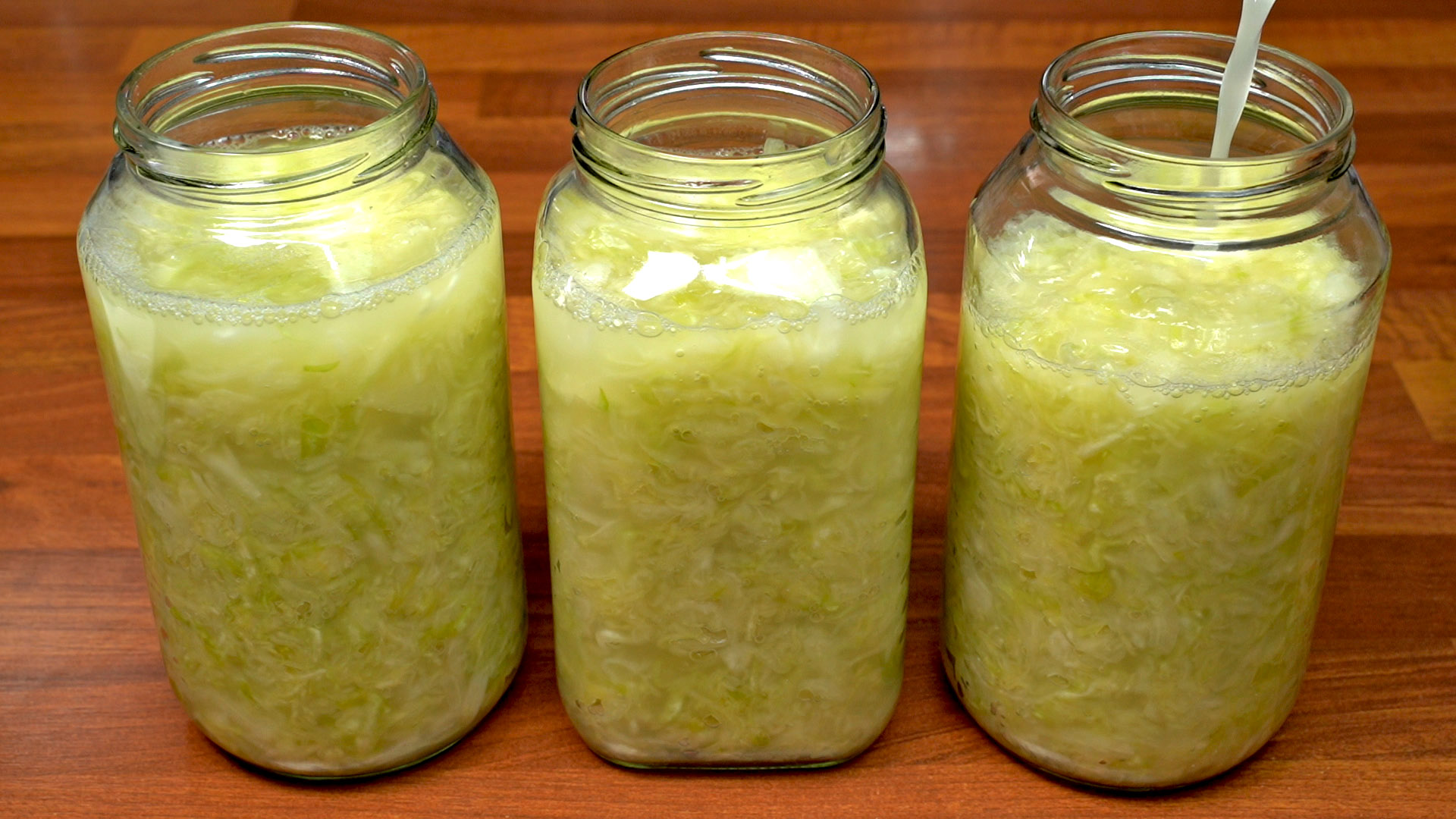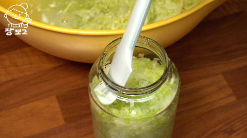 8. 나머지는 15%는 소금물로 채운다. 양배추가 발효되면서 사이사이 기포가 생겨 양배추가 위로 떠오르기에 소금물을 꽉 채우면 넘칠 수 있으니 병 보다 적게 담는다.
