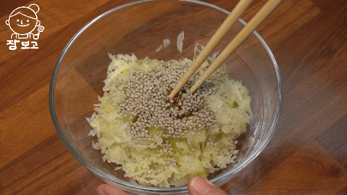 사워크라우트에 엑스트라 버진 올리브오일 약간, 홀그레인 머스터드 약간, 통 들깨 넣어서 잘 섞어준다.