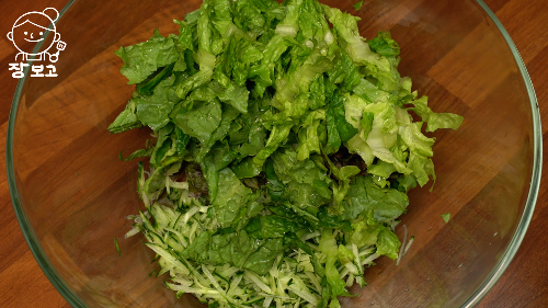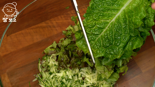 2. 오이 채친 볼에 상추를 가위로 잘게 잘라 넣고, 가볍게 한번 섞는다