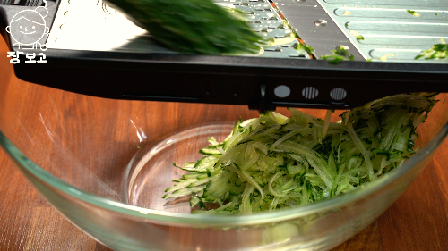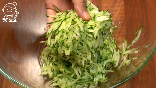 1. 오이는 최대한 얇게 채친다. 단단하고 아삭한 청오이를 사용했는데, 부드러운 백오이를 사용해도 좋다